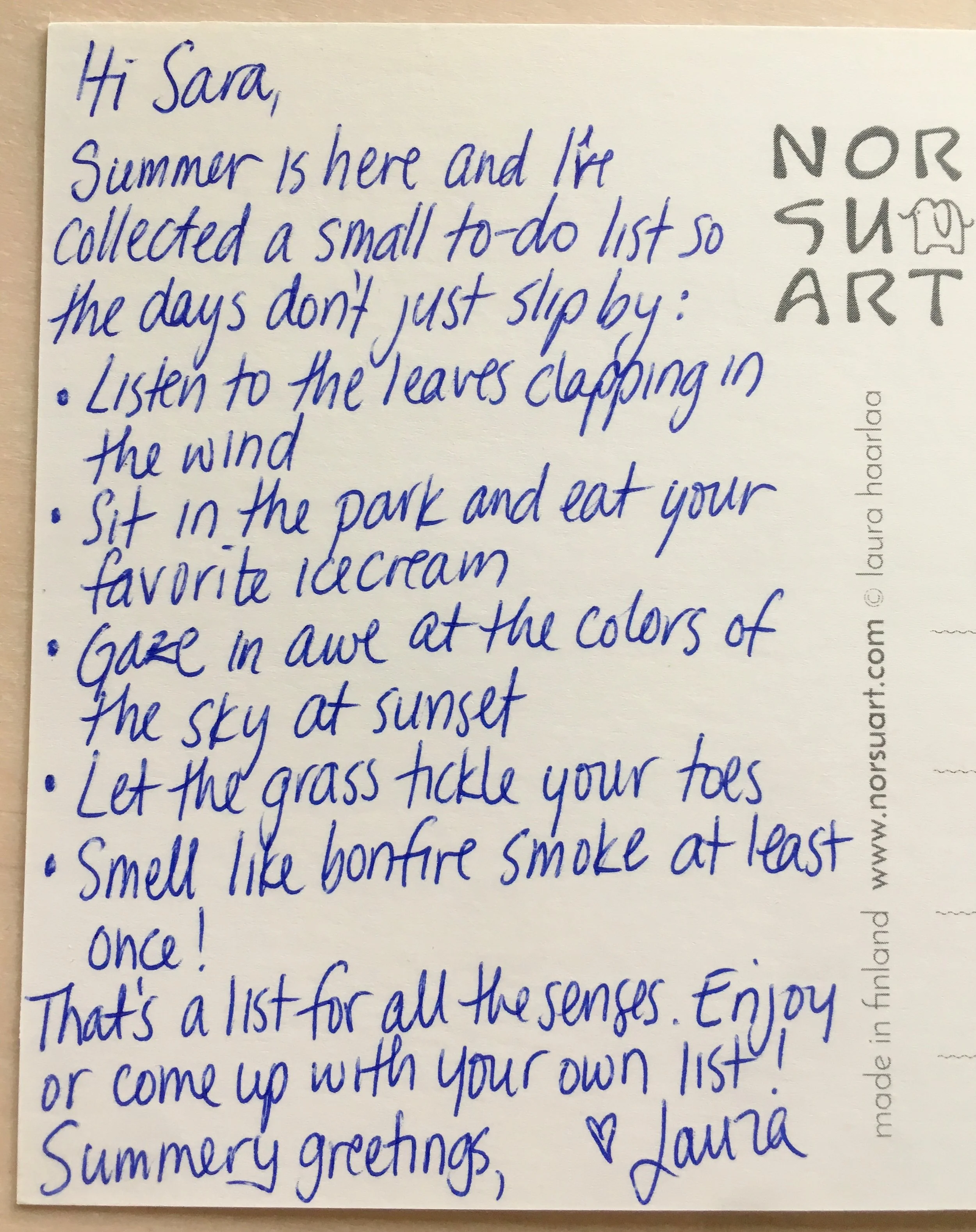 One NorsuArt postcard a month for 12 months, with a hand-written positive message from Laura, delivered to any address in the world.